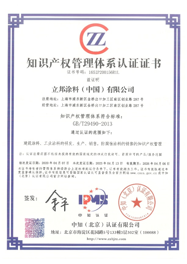 有力支持全面創(chuàng)新”為主題的2023年全國知識產(chǎn)權(quán)宣傳周活動[1]正如火如荼地進(jìn)行。作為創(chuàng)新驅(qū)動型企業(yè),立邦始終注重知識產(chǎn)權(quán)的管理和保護(hù),以此保障嚴(yán)謹(jǐn)?shù)募夹g(shù)研發(fā)工作,穩(wěn)步提升自主創(chuàng)新能力。近日,立邦順利通過國家知識產(chǎn)權(quán)管理專業(yè)機(jī)構(gòu)評審,再次獲得《知識產(chǎn)權(quán)管理體系認(rèn)證證書》,為自身進(jìn)一步規(guī)范知識產(chǎn)權(quán)管理,增強(qiáng)核心競爭力打下了堅實的基礎(chǔ)。