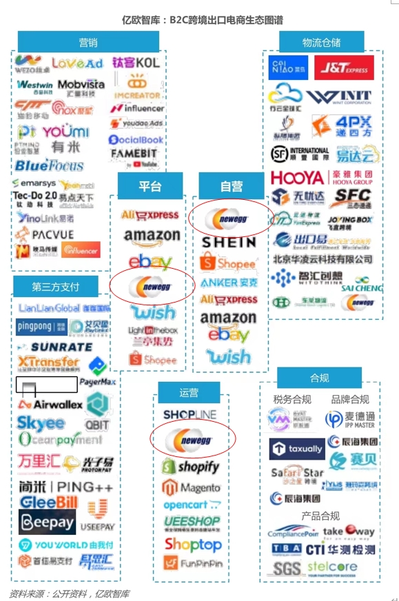 2023年國內知名研究機構億歐發(fā)布權威報告,其中談到出口跨境電商的生態(tài)建設一直處于較為單點部署的狀態(tài),獨立的生態(tài)伙伴解決獨立的問題。構建屬于自己的生態(tài)競爭壁壘,需要尋找能夠將各環(huán)節(jié)的生態(tài)服務串聯(lián)起來的媒介,這個媒介就是第三方平臺。如亞馬遜、新蛋 、易貝等第三方平臺,其具有足夠健全完善的生態(tài)服務體系,覆蓋從建站、營銷、倉儲、物流、運營、支付、供應鏈管理各環(huán)節(jié)服務,在注重特殊性、精細化的同時滿足合規(guī)需求;同時依靠平臺的規(guī)模性,能夠形成較好 的議價能力,提供性價比更高、更為可靠的服務。