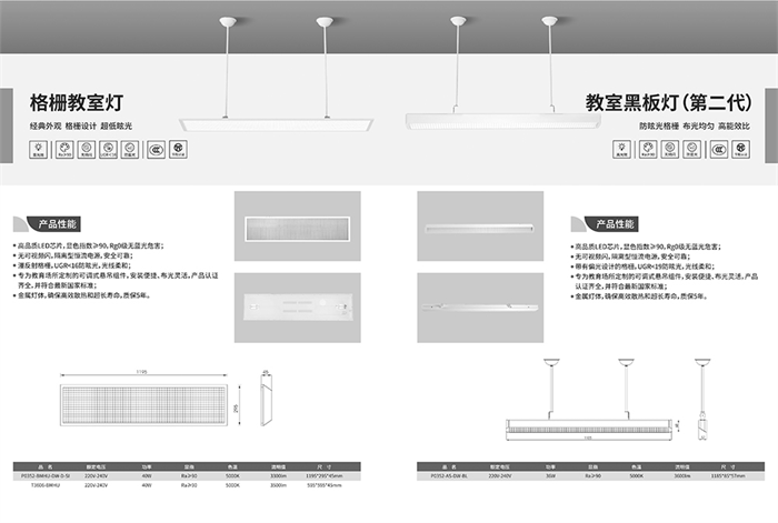 其中,LED UGR教室燈設(shè)計(jì)輕薄,造型簡(jiǎn)約,能夠讓教室煥然一新;LED直下式教室燈采用微棱鏡擴(kuò)散板,發(fā)光均勻柔和;LED格柵教室燈采用格柵面板設(shè)計(jì),光線均勻柔和;LED黑板燈采用漫反射型光柵,高光效,低能耗。
