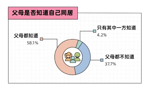尤其值得注意的是,根據(jù)《報(bào)告》,37.7%的年輕人壓根就沒讓父母知道自己已經(jīng)同居,還有4.2%的受訪者表示只讓父母中的一方知道情況。畢竟,父母對(duì)待同居的態(tài)度相對(duì)保守,尤其是女方,《報(bào)告》顯示僅有約三分之一的父母支持女生同居。