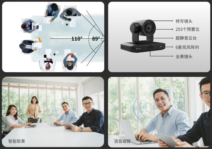 攝像系統(tǒng)由12倍光學變焦特寫鏡頭和110°大廣角的全景鏡頭組成,特寫鏡頭可視角達89°,可將畫面無損放大至12倍,加上自動對焦,不僅能捕捉所有參會人的表情和動作,會議室中的文件和白板內(nèi)容都能在遠端輕松觀看。同時,作為一款會議云臺攝像頭,它能通過6顆麥克風陣列,鎖定發(fā)言人位置,電機實時穩(wěn)定安靜快速地運行轉(zhuǎn)動到當前發(fā)言人,覆蓋會議室多個角度,讓遠程的參會人更具沉浸感和參與感。