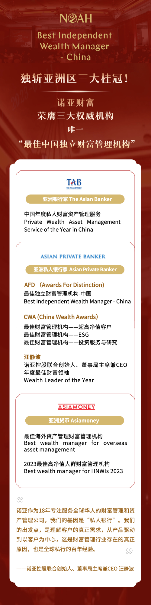 3月27日,諾亞財富在第五屆《亞洲私人銀行家》(Asian Private Banker)中國財富獎(China Wealth Awards)評選中斬獲四大榮譽的優(yōu)異成績,在“超高凈值客戶”、“ESG”、“投資服務與研究”和“年度最佳財富領(lǐng)袖”個人成就獲得權(quán)威認可。在此前的3月8日,諾亞亦作為中國區(qū)唯一獲獎財富管理公司榮獲《亞洲私人銀行家》亞洲區(qū)“2022中國最佳獨立財富管理機構(gòu)”,受邀與法國巴黎銀行、摩根私人銀行、匯豐銀行、花旗銀行、瑞士信貸銀行、澳大利亞國民銀行、國泰世華等國際私人銀行及財富管理標桿一同出席于中國香港舉辦的盛典,也是諾亞財富第六年獲得亞洲私人銀行家的多項認可。