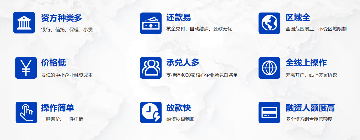 1、資方種類多、授信范圍廣 :包含銀行、信托、保理、小貸等資方,全國(guó)范圍展業(yè),近4000家核心企業(yè)承兌白名單;