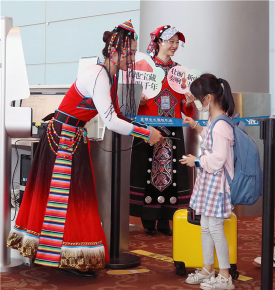 首航當(dāng)天,東航工作人員身著少數(shù)民族服裝,用親切的民族方言向旅客問(wèn)好,引導(dǎo)旅客辦理乘機(jī)手續(xù)。主題航班專(zhuān)屬柜臺(tái)前,頗有云南歷史文化元素的海報(bào)引得旅客駐足觀(guān)看,“媽媽,這是我們?cè)谖麟p版納看到過(guò)的孔雀嗎?”“哇,你看,這是大鵬金翅鳥(niǎo),我在云南省博物館見(jiàn)到過(guò)。”小旅客從辦理值機(jī)就開(kāi)始期待這趟精彩的空中博物館之旅。