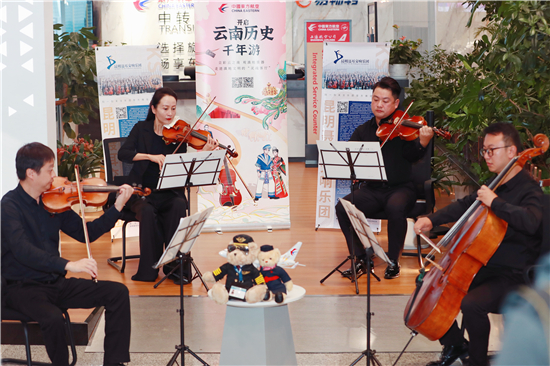 值得一提的是,中國(guó)唯一一支以人民音樂(lè)家“聶耳”命名的交響樂(lè)團(tuán)——昆明聶耳交響樂(lè)團(tuán),在主題航班首航儀式活動(dòng)現(xiàn)場(chǎng),用專(zhuān)業(yè)、優(yōu)雅的演奏,帶領(lǐng)旅客走進(jìn)云南,靈動(dòng)的音符、悅耳的曲調(diào)贏得了旅客的稱(chēng)贊與掌聲。