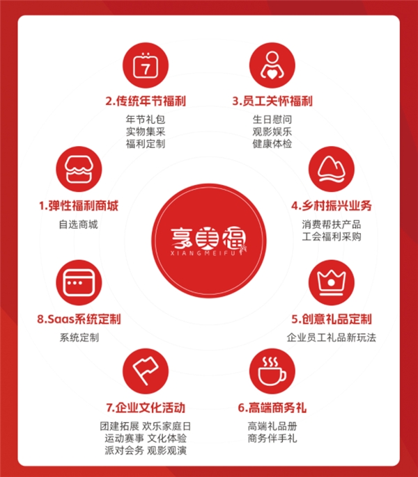 享美福除了企業(yè)活動(dòng)定制之外,還有年節(jié)禮包、Saas系統(tǒng)定制、鄉(xiāng)村振興等業(yè)務(wù)。通過全方位、多角度的企業(yè)福利方案打造,傳遞企業(yè)文化,展示企業(yè)的人文關(guān)懷。