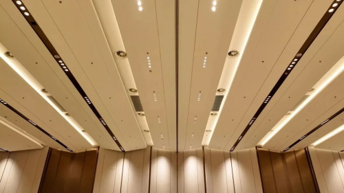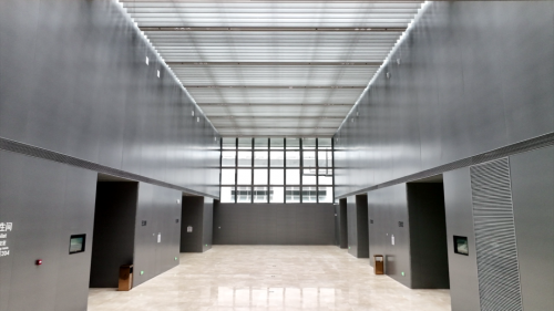 會議門廳,與兩側(cè)VIP前室相連,向北聯(lián)通室外廣場,挑高最高處達24米,采用香檳金色蜂窩鋁板,整體造型呼應建筑鳳“翼”舒展的形態(tài),向北廣場方向傾斜5°。