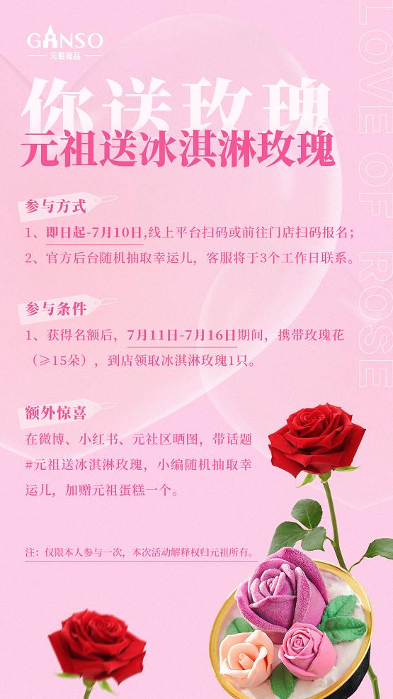 即日起至7月10日,線上平臺掃碼或前往元祖門店掃碼報(bào)名即可參與。官方后臺會隨機(jī)抽取幸運(yùn)兒,獲得名額后7月11日-7月16日攜玫瑰花到店領(lǐng)取冰淇淋玫瑰,為愛人獻(xiàn)上夏日專屬的甜蜜美味。參與活動后,在微博、小紅書、元社區(qū)曬圖,帶話題#元祖送冰淇淋玫瑰#,還有機(jī)會獲得元祖蛋糕一個。