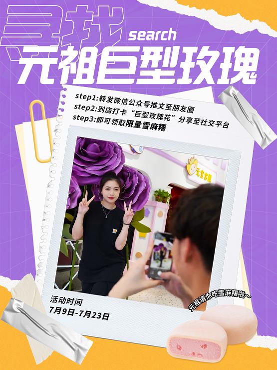 7月9日-7月23日,轉(zhuǎn)發(fā)元祖食品官方微信公眾號巨型玫瑰活動推文,并到店尋找“巨型玫瑰花”,拍照打卡分享至社交平臺(小紅書、抖音、微博等),即可領(lǐng)取限量雪麻糬,超多驚喜福利,點(diǎn)燃夏日激情。