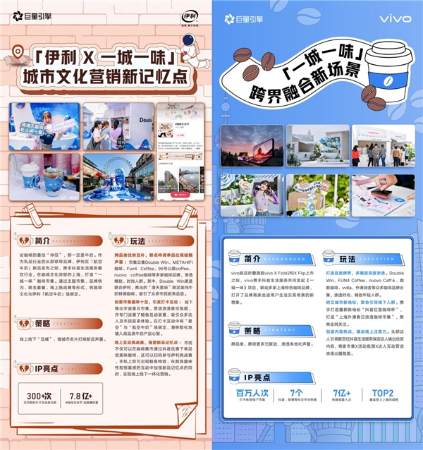 在垂類營銷層面,抖音生活服務(wù)打造《一城一味》IP,分別聯(lián)合vivo、伊利開展跨界營銷,借由上??Х任幕芗啊翱Х仁小钡某鞘形幕?通過線上種草、線下聚合客流打卡體驗的方式,將品牌新品融入用戶高頻生活場景,有力強化上海本地消費者對新品的認知。