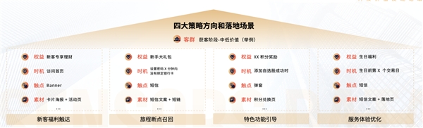? 業(yè)務(wù)策略:匹配業(yè)務(wù)特點(diǎn)和經(jīng)營目標(biāo)的經(jīng)營策略體系,不同業(yè)態(tài)的業(yè)務(wù)策略和場景不同,可嘗試創(chuàng)新的點(diǎn)也不同;匹配業(yè)務(wù)與客群特點(diǎn)的渠道定位和場景建設(shè)