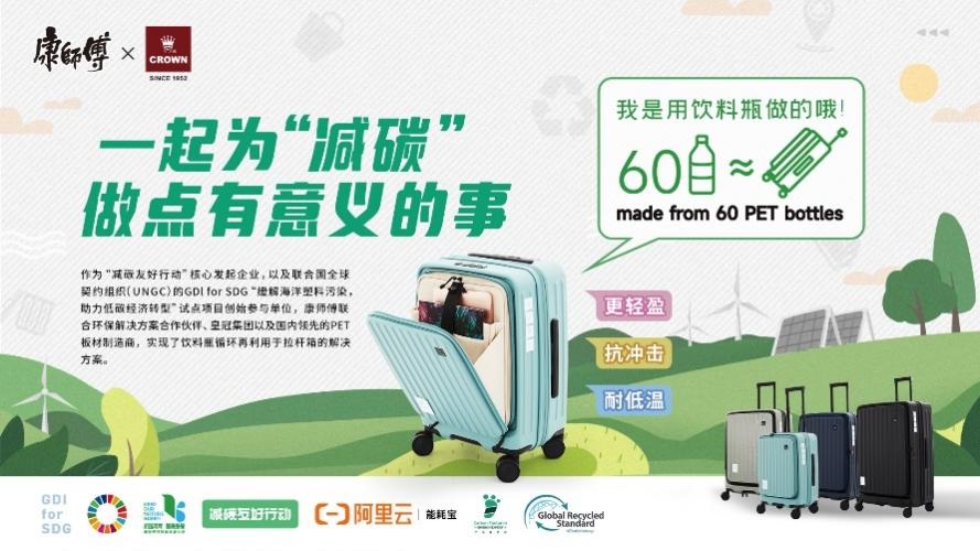 康師傅還作為主要發(fā)起單位之一攜手聯(lián)合國全球契約組織(UNGC)共同發(fā)起了GDI for SDG(全球發(fā)展倡議助力可持續(xù)發(fā)展目標(biāo))的首個(gè)試點(diǎn)項(xiàng)目——“緩解海洋塑料污染,助力低碳經(jīng)濟(jì)轉(zhuǎn)型”,與合作伙伴一道將回收的PET等使用后塑料制品,再造為多種生活消費(fèi)品,又通過電商平臺的銷售推廣,實(shí)現(xiàn)循環(huán)利用。在前不久的世界地球日,康師傅與環(huán)保解決方案合作伙伴共創(chuàng),實(shí)現(xiàn)了用康師傅廢棄飲料瓶制作拉桿箱、野餐墊、收納盒等環(huán)保周邊產(chǎn)品。其中聯(lián)合旅行箱品牌CROWN皇冠,共同推出環(huán)保旅行箱,也是在電商很受追捧,成為第一個(gè)商業(yè)化的rPET項(xiàng)目。由于應(yīng)用了專利技術(shù),旅行箱使用的回收塑料量大,比現(xiàn)有材料更環(huán)保,而且品質(zhì)更好,無異味,更耐沖擊,耐低溫。這個(gè)項(xiàng)目實(shí)現(xiàn)了從塑料循環(huán)利用到商業(yè)價(jià)值鏈的良性循環(huán),讓業(yè)界看到循環(huán)經(jīng)濟(jì)模式的曙光。