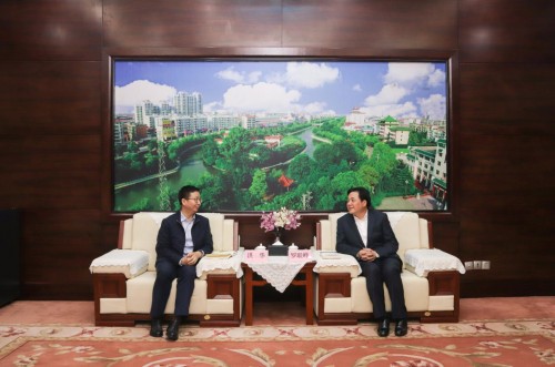 (谷倉新國貨研究院院長(zhǎng)洪華與仙桃市委書記羅聯(lián)峰交流)
