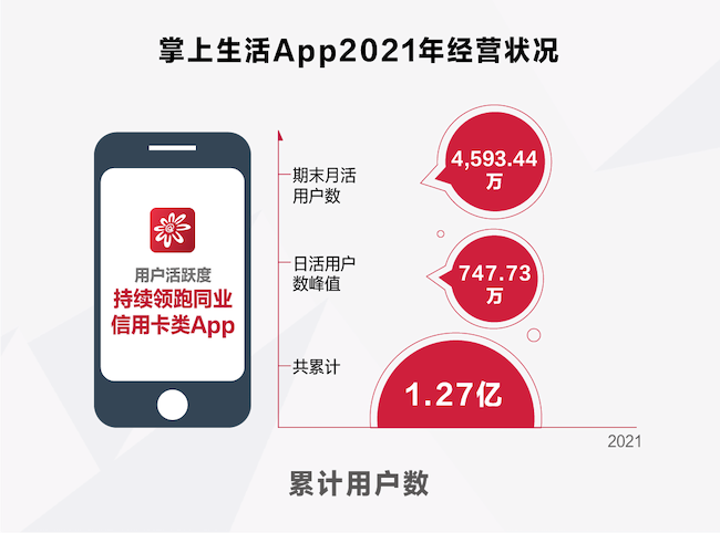 掌上生活A(yù)pp的這些舉措帶來了更高的數(shù)字化獲客水平和用戶增長(zhǎng)空間,為優(yōu)化用戶體驗(yàn)、增強(qiáng)用戶黏性提供了有效路徑。截至2021年底,掌上生活A(yù)pp累計(jì)用戶數(shù)1.27億戶,日活躍用戶數(shù)峰值747.73萬(wàn)戶,期末月活躍用戶數(shù)4593.44萬(wàn)戶,用戶活躍度居同業(yè)信用卡類App前列。