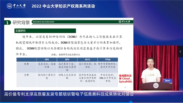 2022年4月28日,在中山大學(xué)的全程指導(dǎo)及越秀區(qū)政府的鼎力支持下,中山大學(xué)科學(xué)研究院、廣州高新區(qū)黃花崗科技園管委會、中山大學(xué)圖書館、廣州中大知識產(chǎn)權(quán)服務(wù)有限公司共同成功主辦中山大學(xué)知識產(chǎn)權(quán)周系列活動高價(jià)值專利支撐高質(zhì)量發(fā)展專題培訓(xùn)暨電子信息類科技成果轉(zhuǎn)化對接會。本次活動采取線上方式開展,邀請兩位業(yè)界專家圍繞高價(jià)值專利支撐高質(zhì)量發(fā)展做專題報(bào)告,多達(dá)178項(xiàng)電子信息類專利項(xiàng)目與83家企業(yè)進(jìn)行了精準(zhǔn)對接,活動在線人數(shù)超2.2萬人,多位知識產(chǎn)權(quán)專家及知名企業(yè)在云端匯聚,助力知識產(chǎn)權(quán)高質(zhì)量發(fā)展。