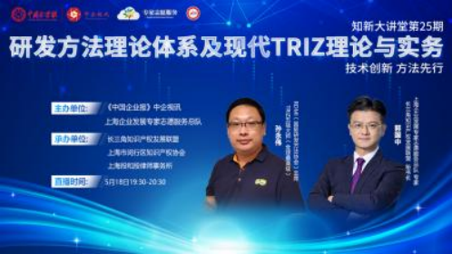 5月18日,中企視訊《知新大講堂》第25期節(jié)目線上開播。RDMI(國際研發(fā)方法協(xié)會)主席、TRIZ五級大師(全球最高級)、DFSS(六西格瑪設計)黑帶大師孫永偉博士做客中企視訊直播間,長三角知識產(chǎn)權發(fā)展聯(lián)盟秘書長郭國中擔任主持人,介紹了現(xiàn)代TRIZ理論體系的組成以及它在技術創(chuàng)新、新產(chǎn)品研發(fā)、專利布局、規(guī)避、挖掘等專利戰(zhàn)略、運用創(chuàng)新大幅降本等方面的重要作用。
