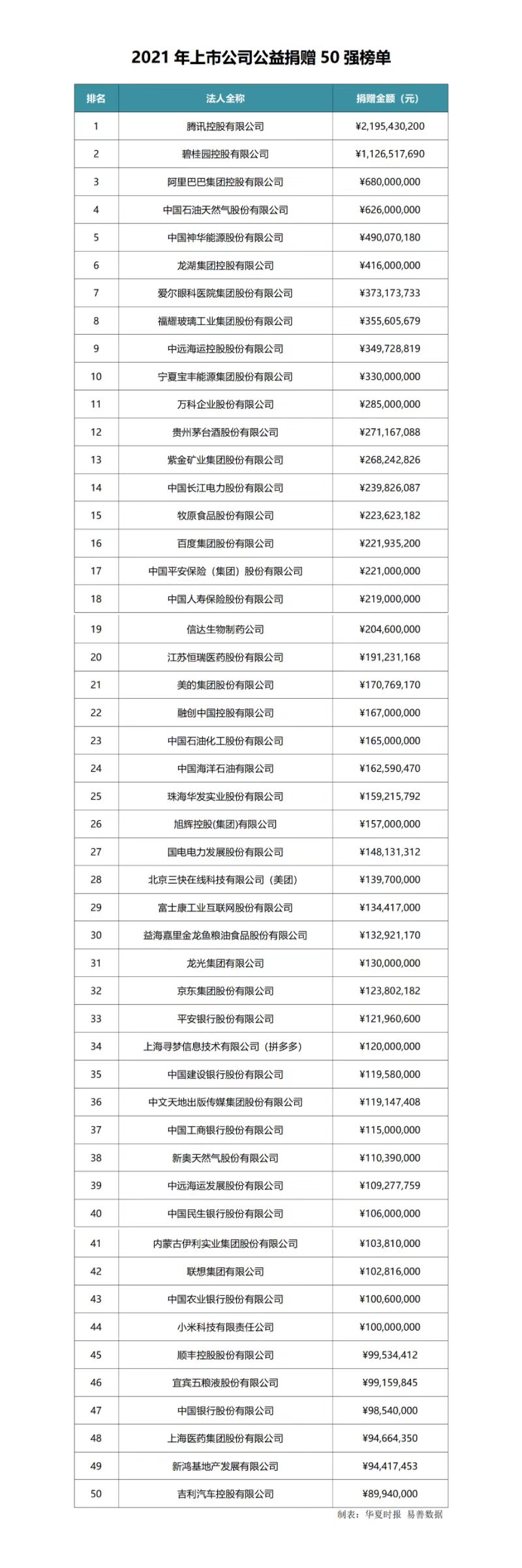 《報告》公布了2021年上市公司公益捐贈50強(qiáng)榜單。