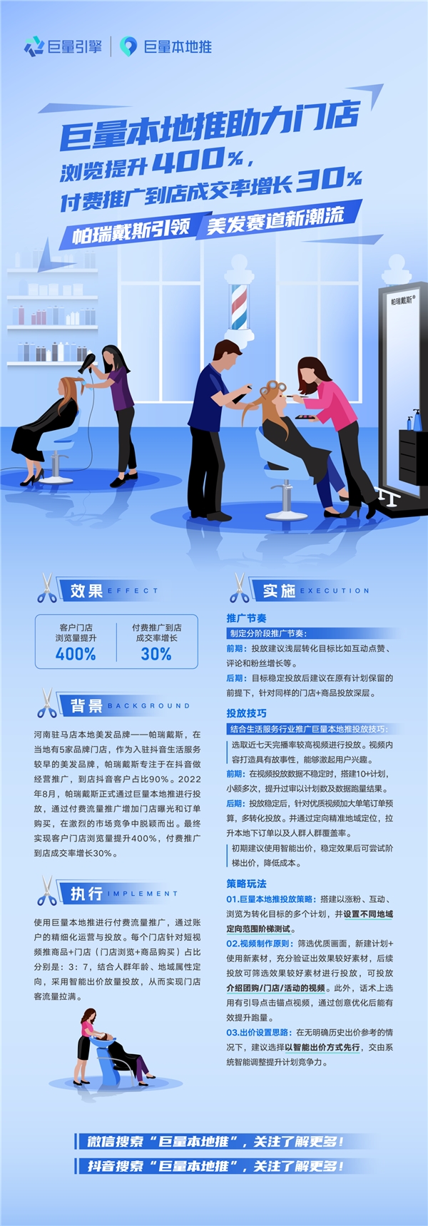 本地生意蘊(yùn)藏著巨大商機(jī),商家如何借助線上平臺或工具,挖掘更多增長機(jī)會呢?「巨量本地推」第二期極星案例大賽,正式揭曉最終獲獎案例榜,獲得「到綜」第一名的河南駐馬店本地美發(fā)品牌帕瑞戴斯,成功在諸多案例中脫穎而出,月均消耗提升4倍,付費推廣到店成交率增長30%,本地到店客戶源源不斷,給本地商家?guī)砹艘恍┰鲩L思路借鑒。