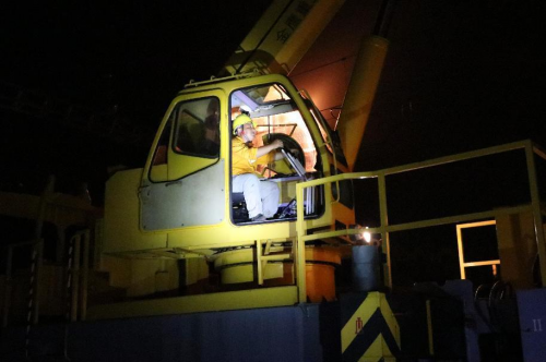 2022年9月22日凌晨0點(diǎn)33分,一聲“開工作業(yè)”嘹亮的口號劃破了??诩澎o的夜空,作業(yè)人員根據(jù)分工有條不絮的開始忙碌起來。1點(diǎn)35分隨著吊車吊臂平穩(wěn)落下,一組長23.03米的橫梁穩(wěn)穩(wěn)的落在鋼柱上,作業(yè)人員迅速對位、連接、緊固、落臂……熟練的操作一氣呵成,順利精準(zhǔn)完成了海南環(huán)島高鐵首次硬橫梁更換作業(yè)。