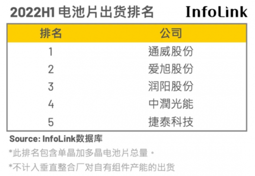 據(jù)PVInfoLink統(tǒng)計,今年上半年晶硅電池總產(chǎn)量約135.5GW。TOP5的通威股份、愛旭股份、潤陽股份、中潤光能、捷泰科技,總出貨量約59GW,占43.54%。另有投研機構(gòu)統(tǒng)計,TOP5出貨中,通威出貨約為22.5GW、愛旭出貨約為17GW、潤陽出貨約為13GW、中宇出貨約為5GW,捷泰出貨約為3GW。