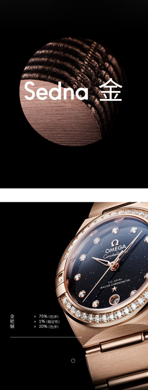 歐米茄研發(fā)的Sedna 18K金由金、銅和鈀三種金屬熔合而成,名字源于太陽系中表面顏色最紅的Sedna小行星,銅的巧妙比例讓Sedna金色澤更柔和雅致,稀有金屬鈀則讓微紅的色澤更加穩(wěn)定,歲月更迭間盡顯華貴雅致風(fēng)范。
