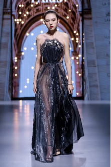 在充滿異域風情的“巴爾米拉女王”主題發(fā)布中,法國高定女裝設(shè)計師JadAdam攜手紹興永耀紡織品有限公司、紹興晶遠創(chuàng)意設(shè)計有限公司展現(xiàn)了尋找內(nèi)心平靜的啟蒙之旅的獨特過程。設(shè)計師從柯橋優(yōu)秀的面料中獲得啟發(fā),在華麗的禮服裙中采用了大量的刺繡及繡片繡珠工藝。兩家企業(yè)提供的閃光高密度歐根紗、銀色金屬絲、清透網(wǎng)眼等面料,花型立體簡潔、色彩透亮多變,為設(shè)計師帶來了豐富的靈感。從晚禮服、婚紗到高級時裝,JadAdam通過特有的藝術(shù)表現(xiàn)手法詮釋了本次禮服設(shè)計。