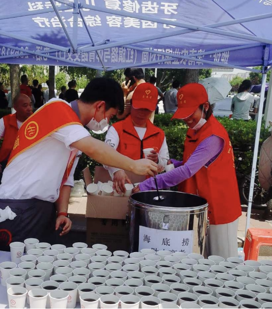在天津市津南區(qū)咸水沽一中高考考點(diǎn)門前,來自海底撈新華城市廣場店的志愿者員工們給助力高考的一線工作人員送上清涼解暑的物資。海底撈天津區(qū)域負(fù)責(zé)人陳驍介紹,每到高考季海底撈門店都會(huì)如約提前做好志愿準(zhǔn)備工作,希望能為考生和考生家長做一些力所能及的事情。
