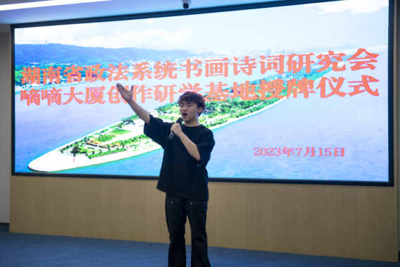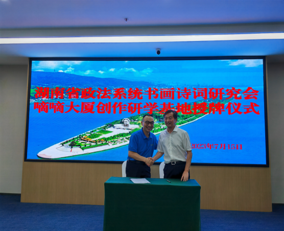 詩(shī)以言志,文以化人。以法護(hù)商,以商促文。7月15日上午,坐落于長(zhǎng)沙市芙蓉區(qū)“中央文化區(qū)”的嘀嘀大廈五樓會(huì)議室高朋滿座,熱鬧非凡?!昂鲜≌ㄎ幕粥执髲B創(chuàng)研基地”簽約暨掛牌儀式在此隆重舉行。省政法系統(tǒng)書(shū)畫(huà)詩(shī)詞研究會(huì)主席團(tuán)成員彭對(duì)喜,副會(huì)長(zhǎng)劉慶富;詩(shī)詞分會(huì)主席陳嶺及副主席賀曦、周加良、江世炎;書(shū)法分會(huì)主席陳祥松、副主席吳若順;長(zhǎng)沙法官文聯(lián)副主席胡軍軍等領(lǐng)導(dǎo)和嘉賓出席活動(dòng)。