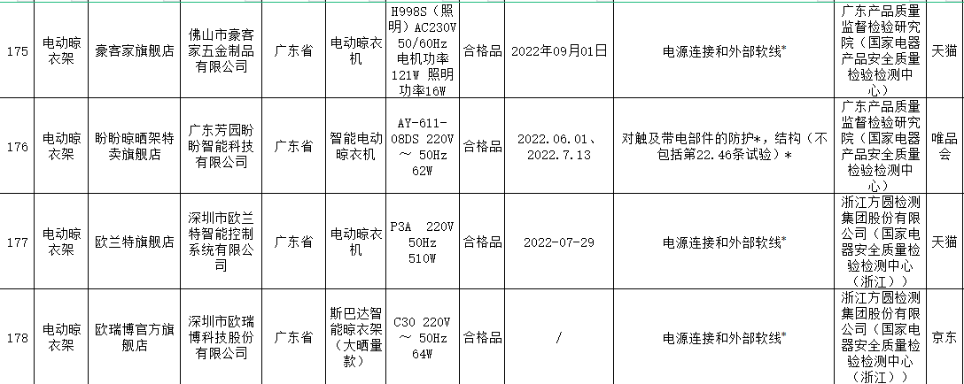 本次電動(dòng)晾衣架抽查檢驗(yàn)9個(gè)省(市)48家企業(yè)生產(chǎn)的52批次產(chǎn)品,包括天貓、京東、拼多多、抖音等電子商務(wù)平臺,發(fā)現(xiàn)24批次產(chǎn)品不合格,涉及卡瑞琪(courage)、顧家、格峰、盼盼、歐蘭特等品牌。
