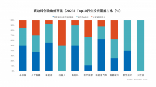 賽迪科創(chuàng)獨(dú)角獸百?gòu)?qiáng)(2023)中,獨(dú)角獸企業(yè)與國(guó)家及地方政府基金、知名資本機(jī)構(gòu)、大型互聯(lián)網(wǎng)企業(yè)投資關(guān)聯(lián)度達(dá)到93%,分別投資覆蓋(含重復(fù))了69家、65家、35家獨(dú)角獸百?gòu)?qiáng),初步形成“知名資本+大型互聯(lián)網(wǎng)企業(yè)+政府投資”三方格局。其中,新能源汽車(chē)、新能源、半導(dǎo)體和新材料行業(yè)政府基金投資覆蓋均超過(guò)50%,成為最受關(guān)注的賽道。